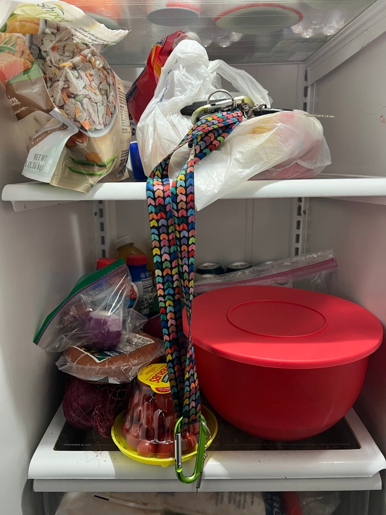 Put your keys on it in the fridge- so you can’t leave without it.